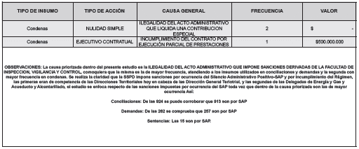 El cuadro que se expone a continuación refleja a nivel nacional, lo ya expuesto usando como insumo conciliaciones, demandas y condenas, tipo de acción o medio de control, la causa general según la parametrización de Ekogui, la frecuencia y el valor de las pretensiones en el caso de las demandas y el valor real de la condena, en el caso de los fallos en contra de la SSPD: