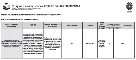 Para priorizar la causa general, se tomó en cuenta que es una de las que presenta mayor frecuencia, valor y que a su vez es prevenible por parte de la Entidad, razón por la cual la Superintendencia de Servicios Públicos Domiciliarios decidió priorizar la causa general denominada ilegalidad de los actos administrativos en el ejercicio de las funciones de inspección, vigilancia y control.