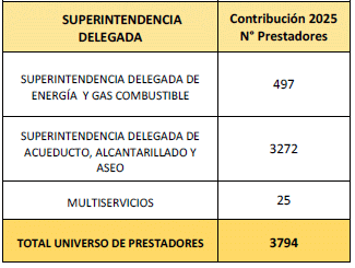 Que, de acuerdo con lo anterior, el reporte de la base de datos de los prestadores, base para realizar el cálculo de la tarifa de la contribución especial en la vigencia 2025, conforme con lo informado por cada Superintendencia Delegada es el siguiente:
