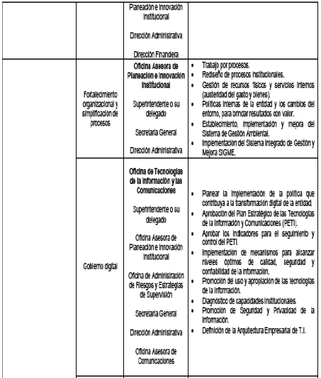 6. Asegurar la implementación y desarrollo de las políticas de gestión y desempeño de que trata el Decreto número 1499 de 2017, el Decreto número 1299 de 2018 y el Decreto número 454 de 2020.