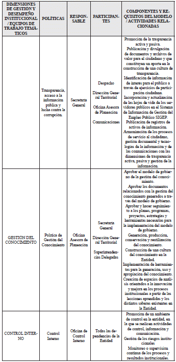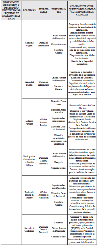 ARTÍCULO 2o. EQUIPOS DE TRABAJO TEMÁTICOS. Para la ejecución de las Dimensiones de Gestión y Desempeño Institucional, previstas en el Manual Operativo del MIPG y las políticas enlistadas en el Decreto número 1499 de 2017, se conformarán los siguientes equipos temáticos, los cuales serán los responsables de presentar propuestas y estrategias de operación, para la implementación y sostenibilidad de las políticas, los componentes y requisitos del modelo.