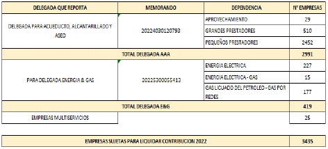 Que mediante memorandos internos número 20225300055413 del 7 de marzo del 2022 y 20225340082803 del 11 de abril del 2022, la Dirección Financiera solicitó a la Superintendencia Delegada de Energía y Gas Combustible y a la Superintendencia Delegada para Acueducto, Alcantarillado y Aseo respectivamente, la base de datos depurada de los prestadores respecto de los cuales la Superservicios ejerció inspección, vigilancia y control durante la vigencia 2021, y que deben ser objeto de contribución especial para la vigencia 2022.