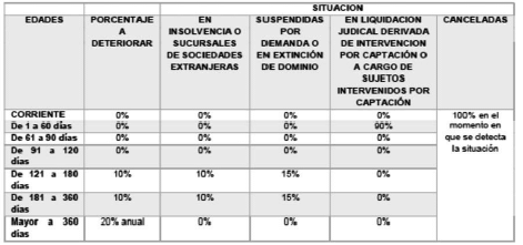 Los criterios de edad de la cartera y situación del sujeto deudor serán acumulables por cada periodo según se muestra en la tabla que se relaciona a continuación: