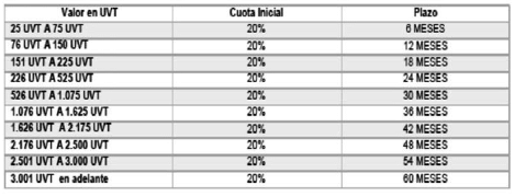 El pago de la cuota inicial podrá diferirse, máximo, a tres (3) meses en aquellos casos en los cuales la obligación supere los 1.233 UVT. Sólo hasta que sea cubierta la totalidad de la cuota inicial se levantarán los embargos sobre las cuentas bancarias del obligado, cuando ya hubieren sido practicadas. Durante este tiempo se causarán intereses de mora sobre saldos de capital cuando se trate de contribuciones.