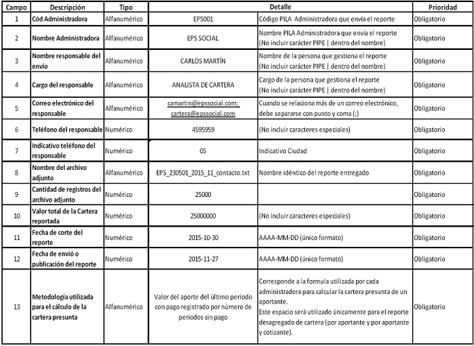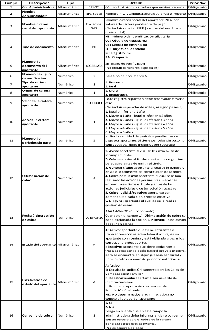 Reporte desagregado de Cartera: El reporte desagregado de cartera corresponde a la deuda identificada por aportante, incluyendo datos adicionales como: 1) el número de periodos sin pago; 2) tipo de cartera; 3) origen de la cartera; 4) última acción de cobro adelantada, etc. Corresponde al total de la cartera identificada por la administradora con incumplimiento igual o superior a treinta (30) días calendario a la fecha de corte y reportada en los meses de enero, abril, julio y octubre de cada año.