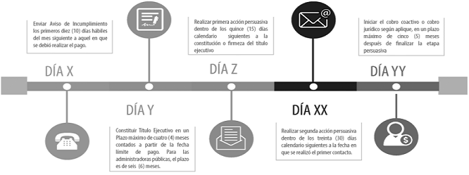 d) Los plazos para el envío de las acciones persuasivas. Tener en cuenta que el primer contacto lo deben realizar dentro de los quince (15) días calendario siguientes a la fecha de constitución o firmeza del título ejecutivo, según el caso, y el segundo, dentro de los treinta (30) días calendario siguientes a la fecha en que se envió la primera comunicación sin superar cuarenta y cinco (45) días calendario;